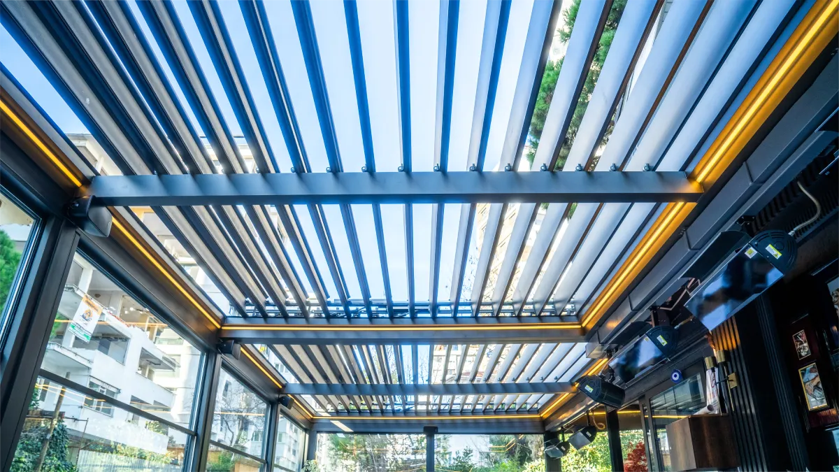 Si se colocan en una posición intermedia, las lamas filtran la radiación solar y reducen el deslumbramiento sin bloquear la claridad del día. En cambio, cuando se cierran totalmente, forman una cubierta estanca que protege eficazmente de la lluvia y el viento. Además, su diseño incorpora un sistema de drenaje interno que evacua el agua hacia pilares o canales laterales, evitando acumulaciones y manteniendo el área inferior seca incluso durante lluvias intensas.